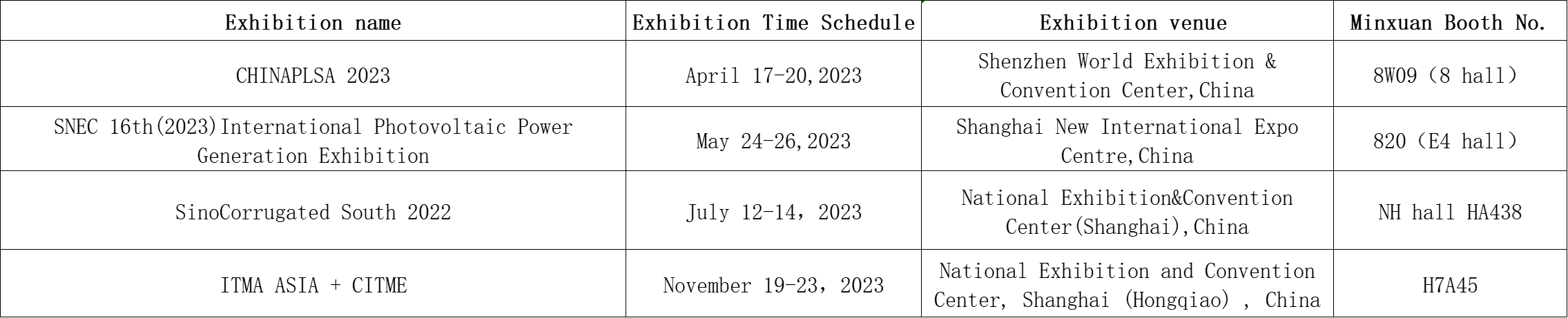 Dear customers and friends: The following is the exhibition information of our company's Minxuan Technology in 2023. At that time, we sincerely invite you to visit the company's booth for guidance.