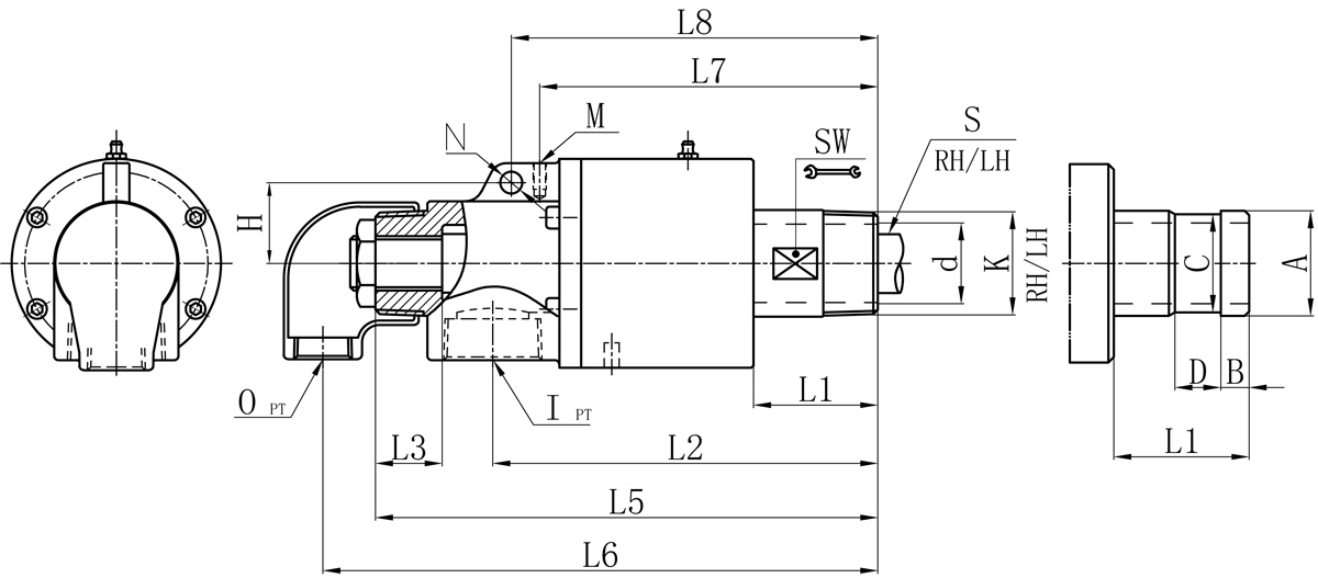 Model K I O S d L1 L2 L3 L5 L6 L7 L8 M N H SW 法蘭式外管尺寸對照表